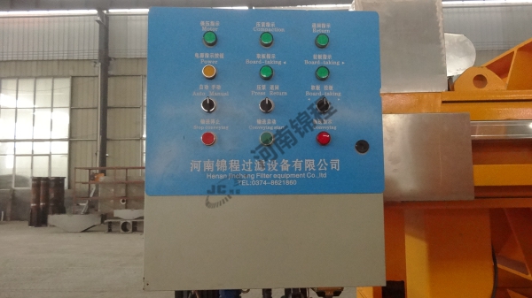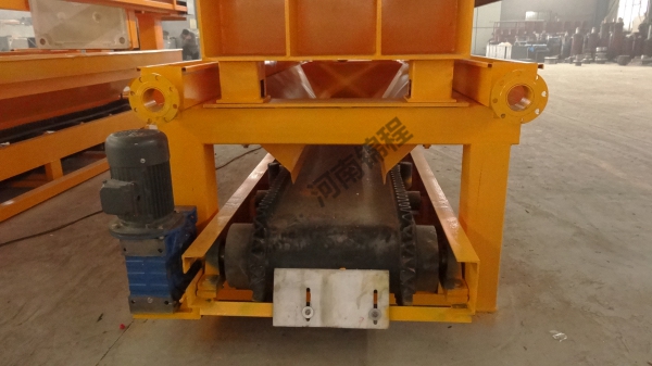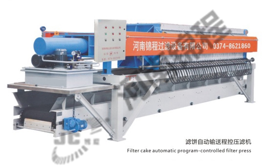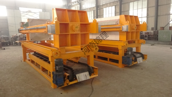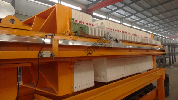 在液壓缸的作用下,壓濾機(jī)濾板沿主梁移動(dòng)壓緊,使相鄰濾板間形成濾室,周邊密封。煤泥水經(jīng)人料泵以一定壓力從人料孔給人各濾室,借助人料泵的給料壓力在過濾介質(zhì)兩側(cè)形成的壓力差實(shí)現(xiàn)固液分離,煤泥顆粒滯留在濾室內(nèi),濾液透過過濾介質(zhì)從濾板的導(dǎo)水孔排出機(jī)外。經(jīng)過一段時(shí)間后,濾液不再流出,過濾脫水過程完成。停止入料,由鏈條拉開濾板,濾餅脫落后,由壓濾機(jī)下的刮板輸送機(jī)或膠帶機(jī)運(yùn)走。
